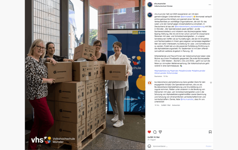 Im Jahr 2023 startete Ammareal sein Engagement in der D-A-CH-Region und suchte mit dem BVAG als Spendenempfänger gezielt jenen Verein aus, der seit 1984 bundesweit in der Alphabetisierung engagiert ist. Der BVAG ist aktuell der einzige Verein in Deutschland, dem Anteile aus den Verkaufserlösen zugutekommen. Das Unterstützernetzwerk von Ammareal wächst: So konnte von 2023 bis 2025 die Anzahl an Partnerschaften deutlich ausgebaut werden. Die aktuelle Unterstützerbasis im D-A-CH-Raum beläuft sich auf 150 Partner. Im Jahr 2024 sortierte Ammareal 3,6 Millionen Kulturgüter von über 2.000 Partnern, die dem Unternehmen vertrauen. Dank dieser Bemühungen wurden 930 000 Artikel verkauft, wodurch sechs Wohltätigkeitsorganisationen finanziell unterstützt werden konnten, darunter der Bundesverband Alphabetisierung und Grundbildung e.V“. Quelle: https://bibliotheksportal.de/advertisementnews/zwei-jahre-ammareal-in-deutschland/